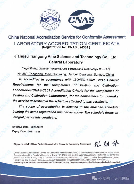 Recently, the China National Accreditation Service for Conformity Assessment (CNAS) officially granted national accreditation to the Central Laboratory of Jiangsu Tiangong Aihe Technology Co., Ltd. (Tiangong Aihe Central Laboratory), with the accreditation registration number CNAS L24384. This achievement signifies that Tiangong Aihe has fully met national and international standards in laboratory management system construction, technical capabilities, and testing proficiency, demonstrating its ability to issue authoritative, accurate, and internationally recognized test data.
